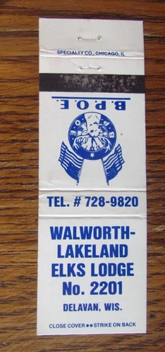 ELKS CLUB LODGE #2201 MATCHBOOK COVER: DELAVAN, WISCONSIN EMPTY MATCHCOVER -M9