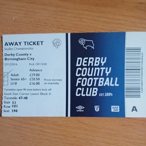 Ticket : 2016/2017 27/12/2016 Championship Derby County v Birmingham City