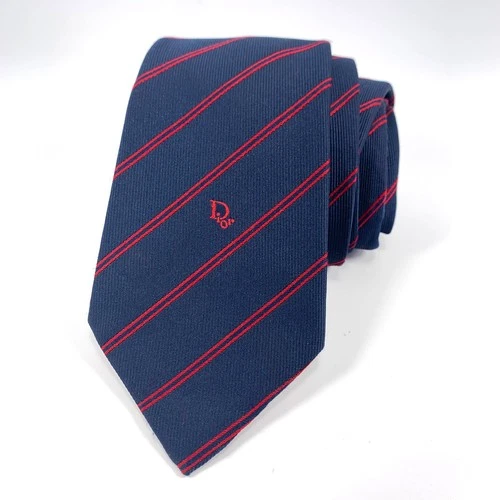 Vintage Christian Dior Mens Tie Navy Blue w/ Red Stripes Poly Silk Repp LOGO