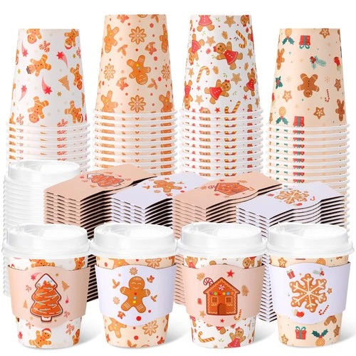 100 Set Christmas Disposable Coffee Cups with Lids and Sleeves Bulk 8oz Ginge...