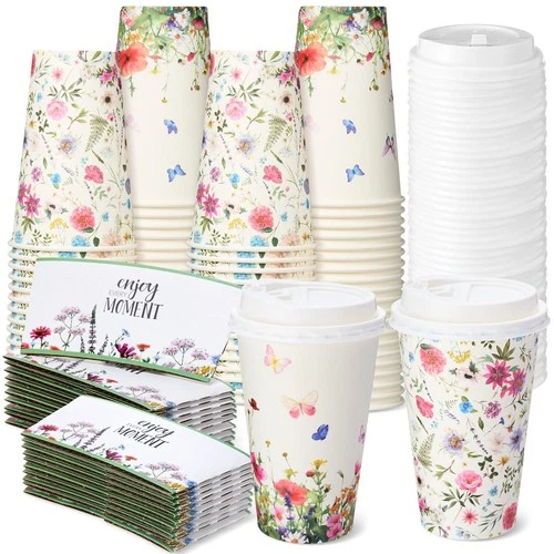 50 Sets 16oz Floral Disposable Coffee Cups with Lids and Sleeves Vintage Spri...