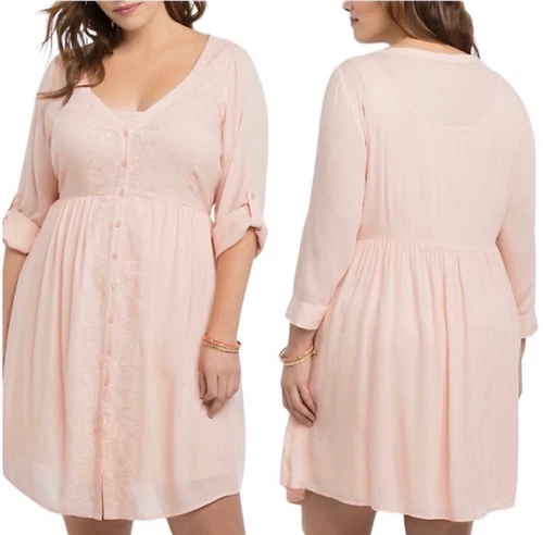 Torrid Embroidered Button Up Shirt Dress Roll Tab Sleeves Size 1 Flowy Casual