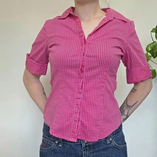 Vintage Y2K Early 2000s Hot Pink Polka Dot Button Up Top