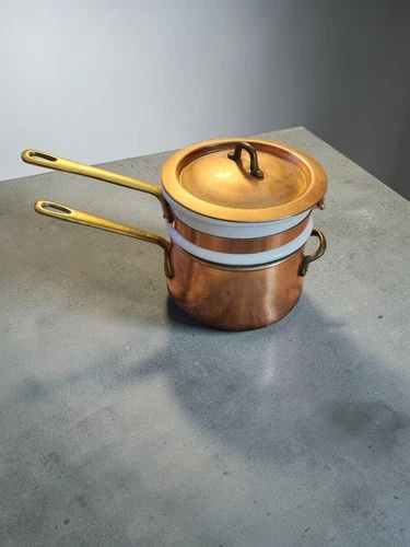 Vintage Korea Copper & Ceramic Pot Pan Double Boiler w/ Brass Handles 7” Diamete