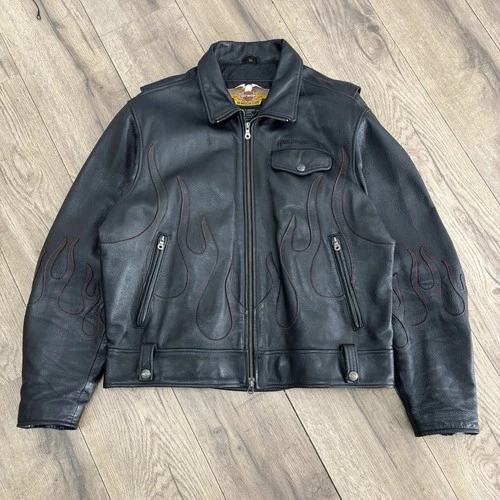 2000s Double Zipper Embroidered Harley Davidson Flame Leather Biker Jacket