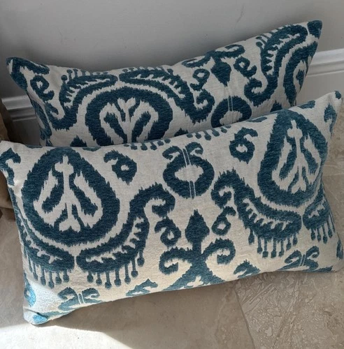 Pair of Ikat Greenish Blue Rectangle Lumbar Decorative Pillow With down Insert
