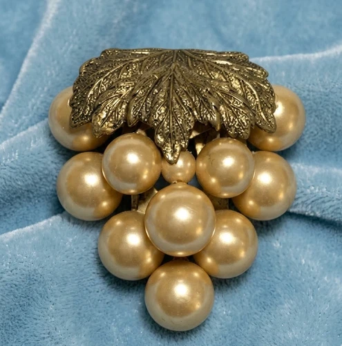 Vintage Grape Cluster Faux Pearl Dress Clip Golden Tones Belt Scarf Sash Clip