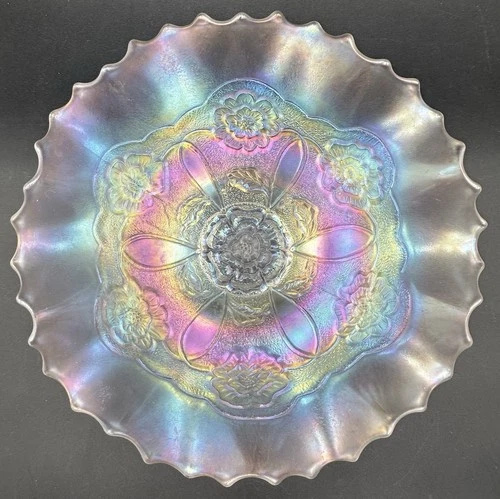 Dugan Carnival Glass Dome Base Ruffled Bowl Double Stem Rose Pattern Iridescent