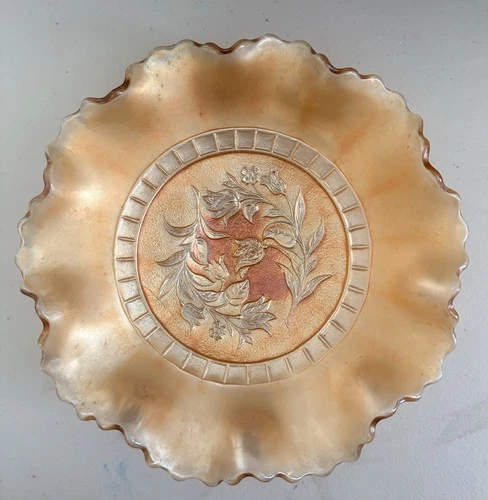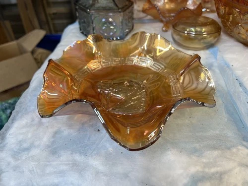 Vntg. MCM Dugan Horses Pony Iridescent Marigold Carnival Glass Dish Ruffled Bowl