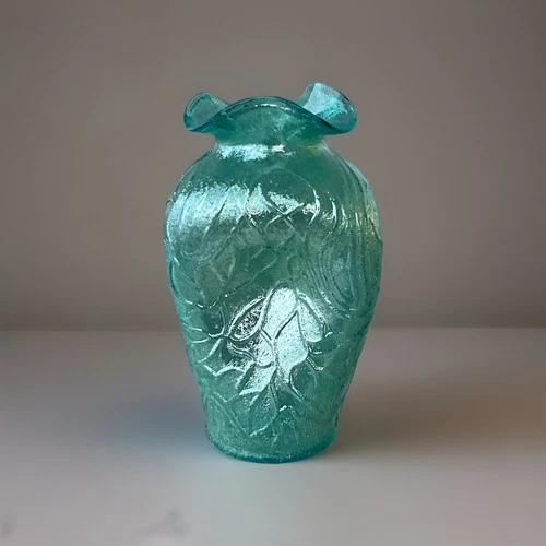 Antique Dugan Frit Art Glass Pinched Iridescent Vase Aqua *CHIPS*