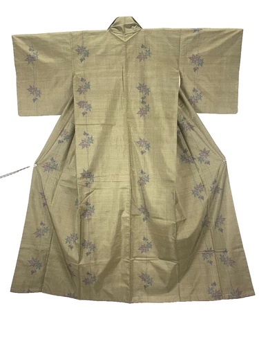 Vintage Silk Tsumugi Kimono XS 24.4in Yuki Japan Katazome Maple Chrysanthemum