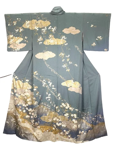 Vintage Yuzen Kimono M 25.2in Yuki Japan Gold Houmongi Sakura Wave Green Gray