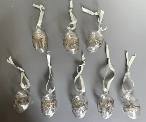 Hand Blown Clear Egyptian Glass Silver Etched Christmas Ornaments Set Of 8