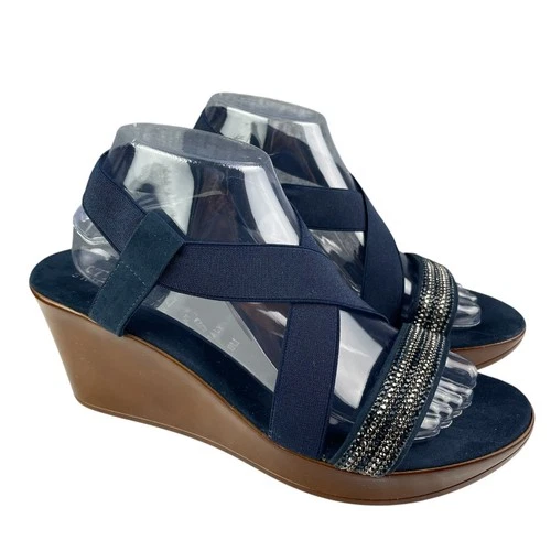 Italian Shoemakers Wedge Sandals Women’s 10M Navy Elastic Straps Rhinestones