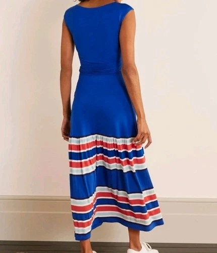 Boden Mila Trim Tiered Jersey Dress 14L Blue Tie Waist Striped Bottom Nautical