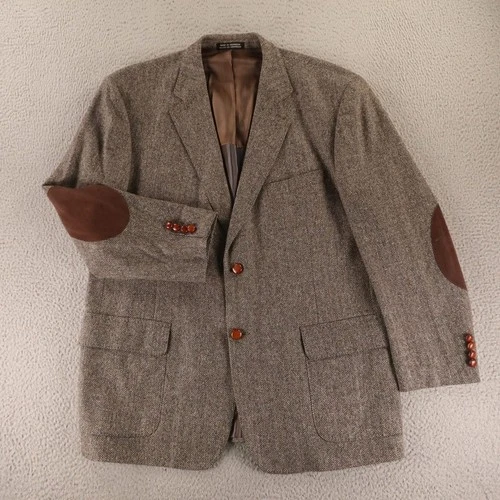 Tweed Jacket 46R XL Gray Herringbone Wool Silk Elbow Patches Wooden Buttons