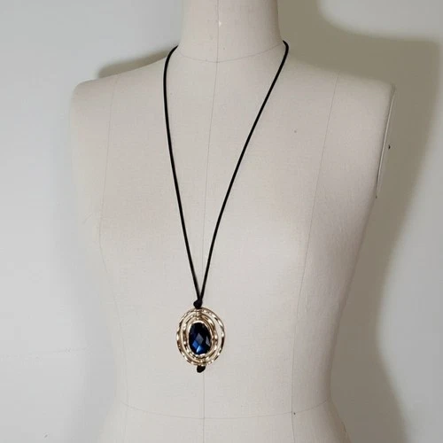 Bella Jack 31-34" Necklace Blue Glass Faceted Stone Gold Hardware Leather Cord