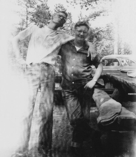OVER EXPOSED 1953 Men Friends Portrait Casual Embrace Forest Car Background