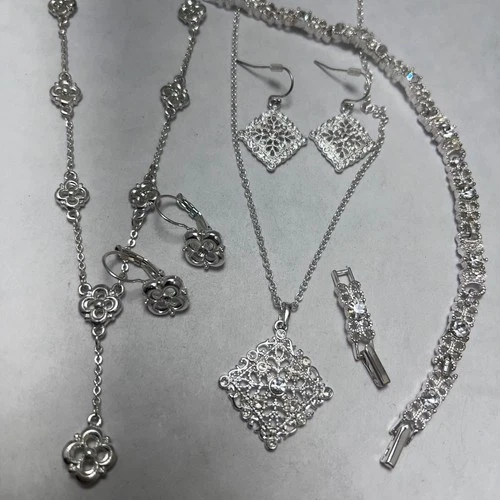 Silver Tone Filigree Rhinestone Jewelry Set Necklaces Earrings Bracelet Avon