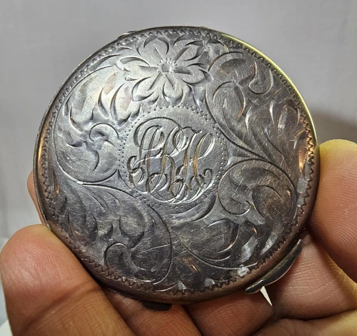 Sterling Silver Make-up Round Powder Compact Mirror Etched Flower wMono-54g-READ
