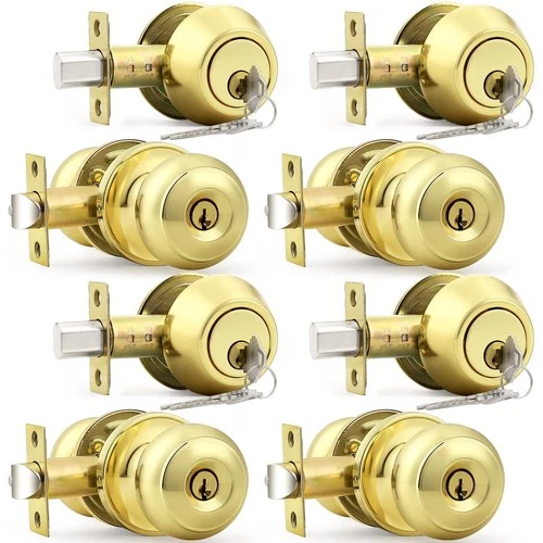 Probrico Polished Brass Keyed Entry Door Knob and Double Cylinder Deadbolt Lo...