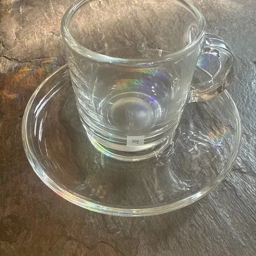 Nespresso Small 2.5"TALL GLASS Logo Coffee Clear Espresso Shot +Saucer NEW +Box