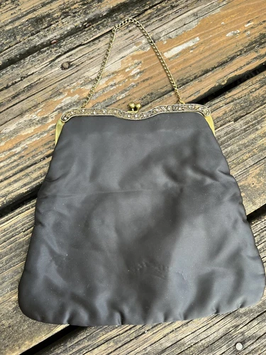 Black Satin Fabric Clutch Purse Evening Bag Gold Jeweled Frame Chain Vtg 50s 60s