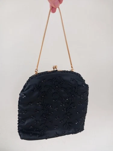 Vintage Black Sequin Beaded Evening Bag Hand Made in Hong Kong