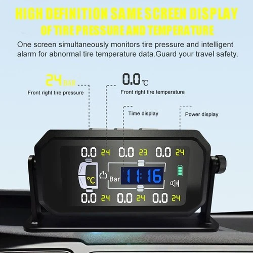 `Wireless Tire Pressure Monitor With 4 External TPMS Sensor Solar USB Charging
