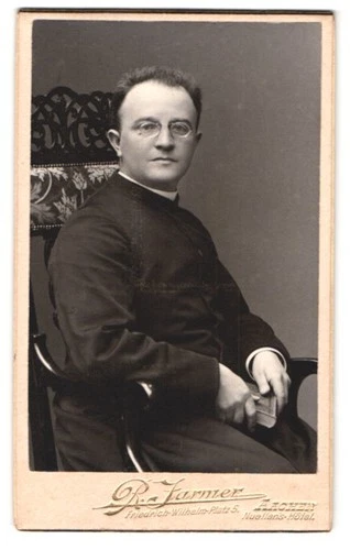 Photograph R. Jarmer, Aachen, portrait of young pastor in gown with glasses