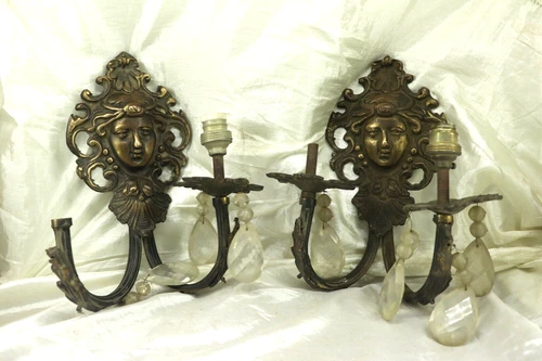 VINTAGE PAIR OF BRASS LAMPS HOLDER ART WOMAN'S FACE, BOW EUROPEAN LIGHTING