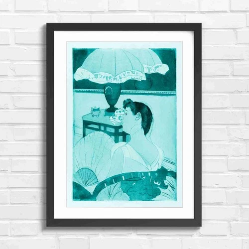 Elegant Woman With Parasol And Fan Teal Framed Wall Art Print Large Picture Home