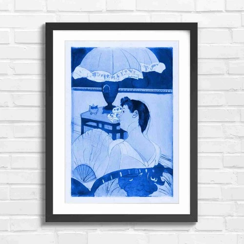 Elegant Woman With Parasol And Fan Blue Framed Wall Art Print Large Picture Home