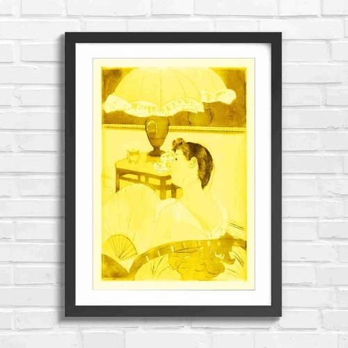 Elegant Woman With Parasol And Fan Yellow Framed Wall Art Print Large Picture