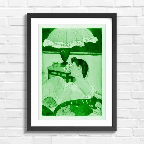 Elegant Woman With Parasol And Fan Green Framed Wall Art Print Large Picture