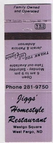 Matchbook Cover Jiggs Homestyle Restaurant West Fargo North Dakota