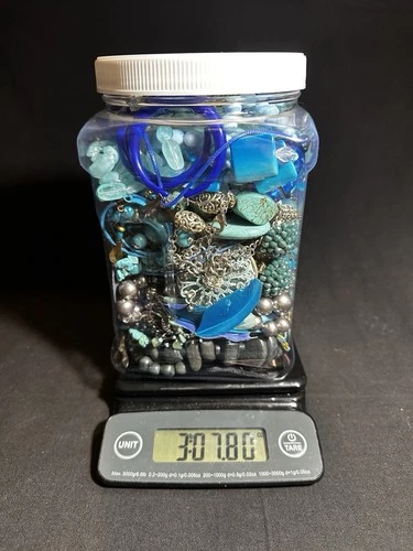 Blue Tone Wearable Jewelry Jar 3 lb 7 oz Mixed Beaded Necklace Bracelet Lot.