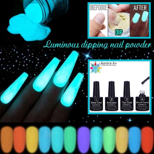 GLOW IN THE DARK DIPPING LUMINOUS NAIL POWDER Dip 12 COLOURS PIGMENT LIQUIDS UK
