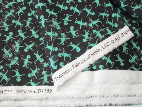 Tiny Green Aliens & Stars on Black Cotton Fabric 1 Fat Quarter Approx 18" x 21"