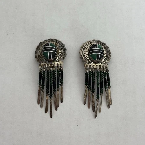Vintage Southwestern Malachite Dangle Earrings Sterling Silver Feather
