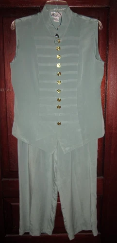 Fiji Sport M 100% Silk Pants Suit Top Blouse Shirt Sleeveless Button Sage Green