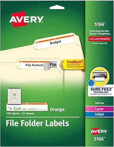 Avery 5166 TrueBlock File Folder Labels, Laser/Inkjet, 1/3 Cut, Orange, 750/PK