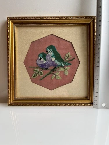 Vintage Green/Purple Birds Needlepoint Tapestry Framed 21x21cm