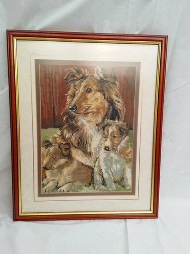 Vintage Cross Stitch Picture Collie Dog & Puppies ~ Framed ~ 54x44cm