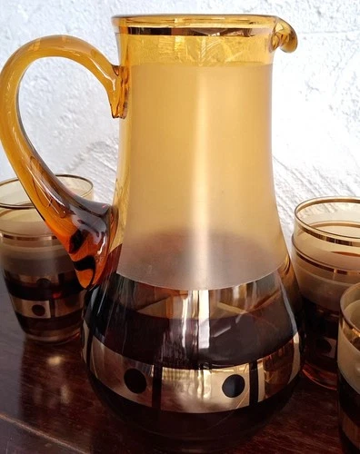 Mid 20th century amber and gold accent glass water set for 5 | Jug and 5 glasses