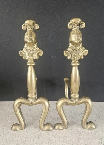 Vintage Pair of Solid Brass FIRE DOGS with Medieval Knight Heads