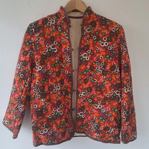 Vintage 1970's 80's Quilted Floral Red Jacket Large Womens Hippie Gypsy Flower