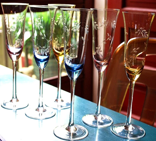 Vtg Set 6 HAND BLOWN MULTICOLOR GLASS Champagne Flutes HAND CUT LEAVES 9.5" 6 oz