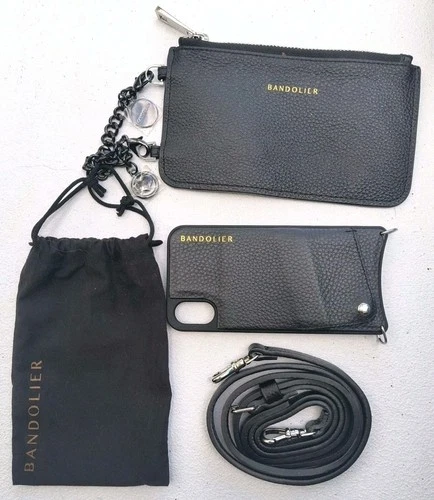 Bandolier iPhone X XS Crossbody Phone Case Black Gold Leather Pouch & Wallet Set