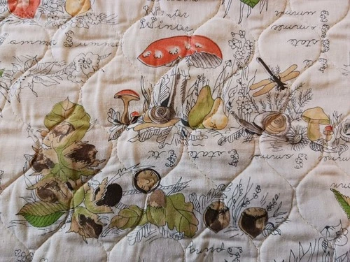 Neat Vtg 1970s Homemade Small Throw Lap Quilt Blanket w Mushrooms Fruit Acorns S
